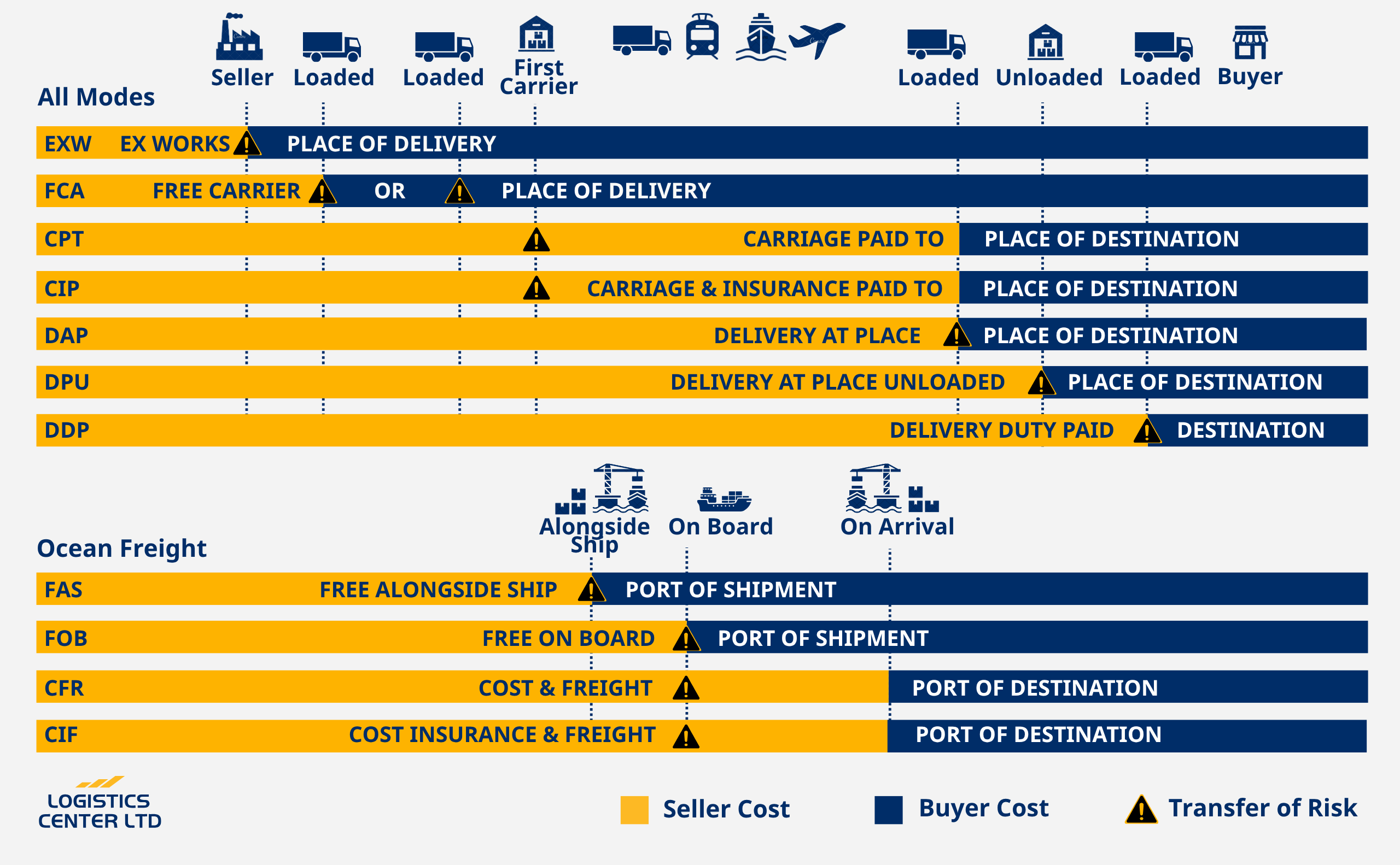 - CIF (Cost, Insurance & Freight): Όπως το CFR, αλλά ο πωλητής καλύπτει και ασφάλιση.